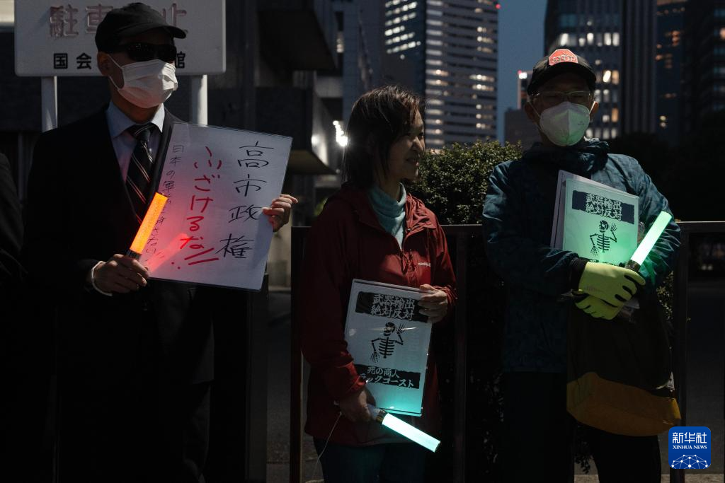 4月16日,在位于日本东京的首相官邸前,抗议者手持标语参加集会。新华社记者 贾浩成 摄